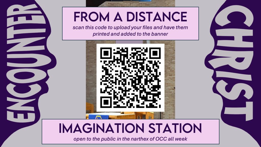 There will be an imagination station set up in the OCC all week. You are invited to respond to the Gospel text visually–drawing, abstract colors and shapes, words–and add it to the banner. Each panel will be added to the banner on Wednesdays in Chapel. Use the QR code below to upload your contribution. We will print it and add it for you.